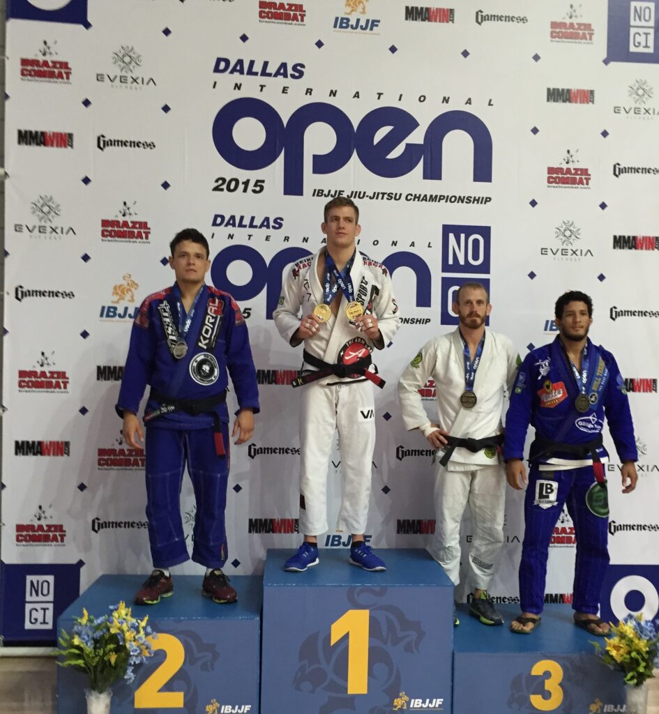 Notable black belt tournaments include the 2015 International Brazilian Jiu-Jitsu Federation Dallas Open with adult black belt absolute bronze medals for gi and no gi.